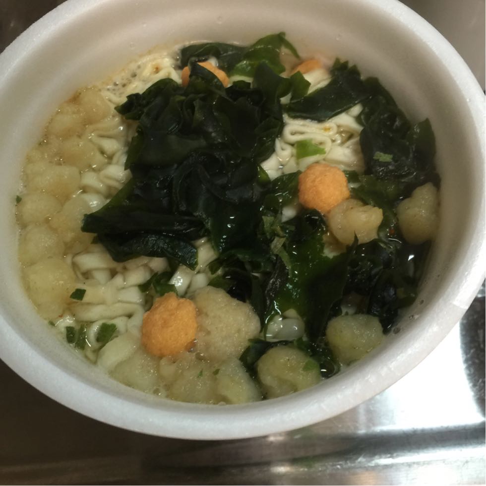 どん兵衛の、麺と出汁増量に揚げを引いてわかめを足した感じで、食べ応えあり。